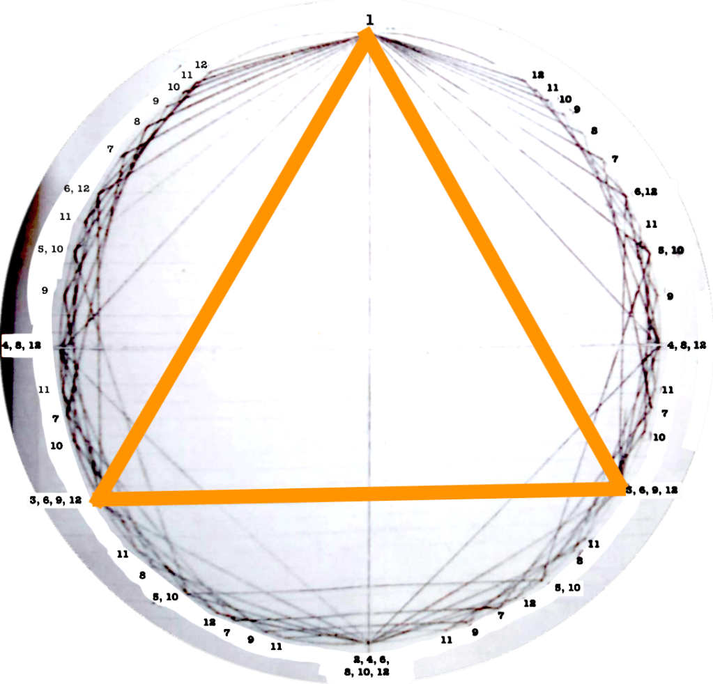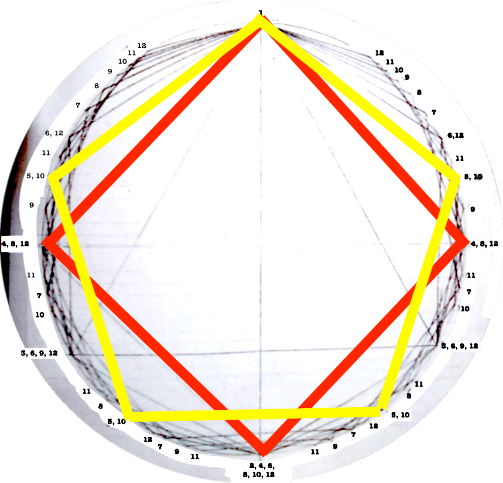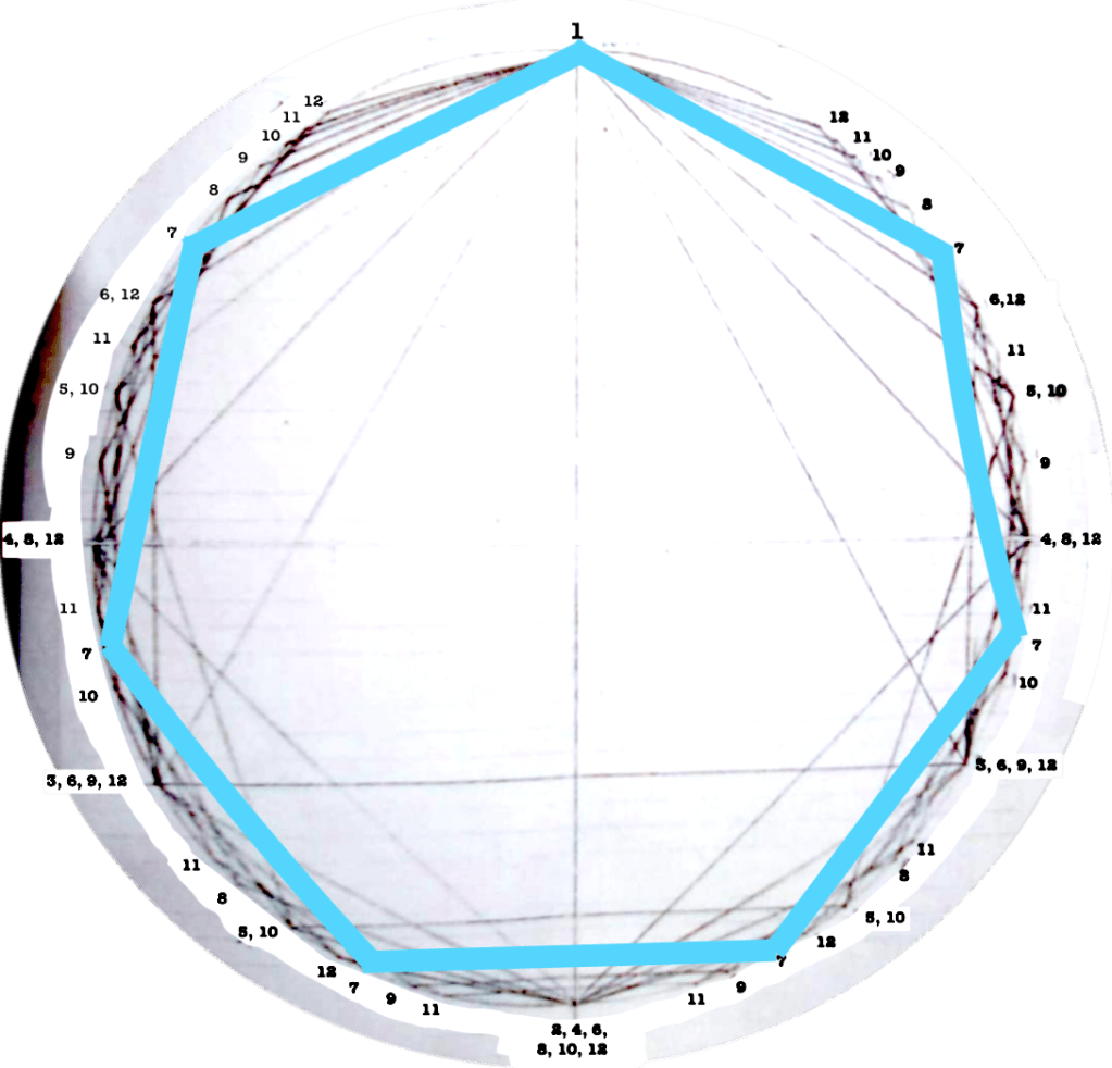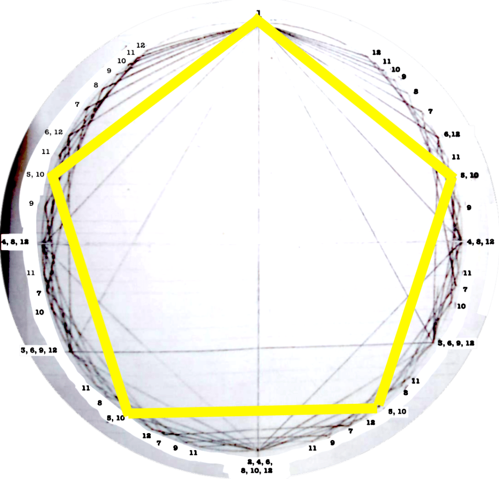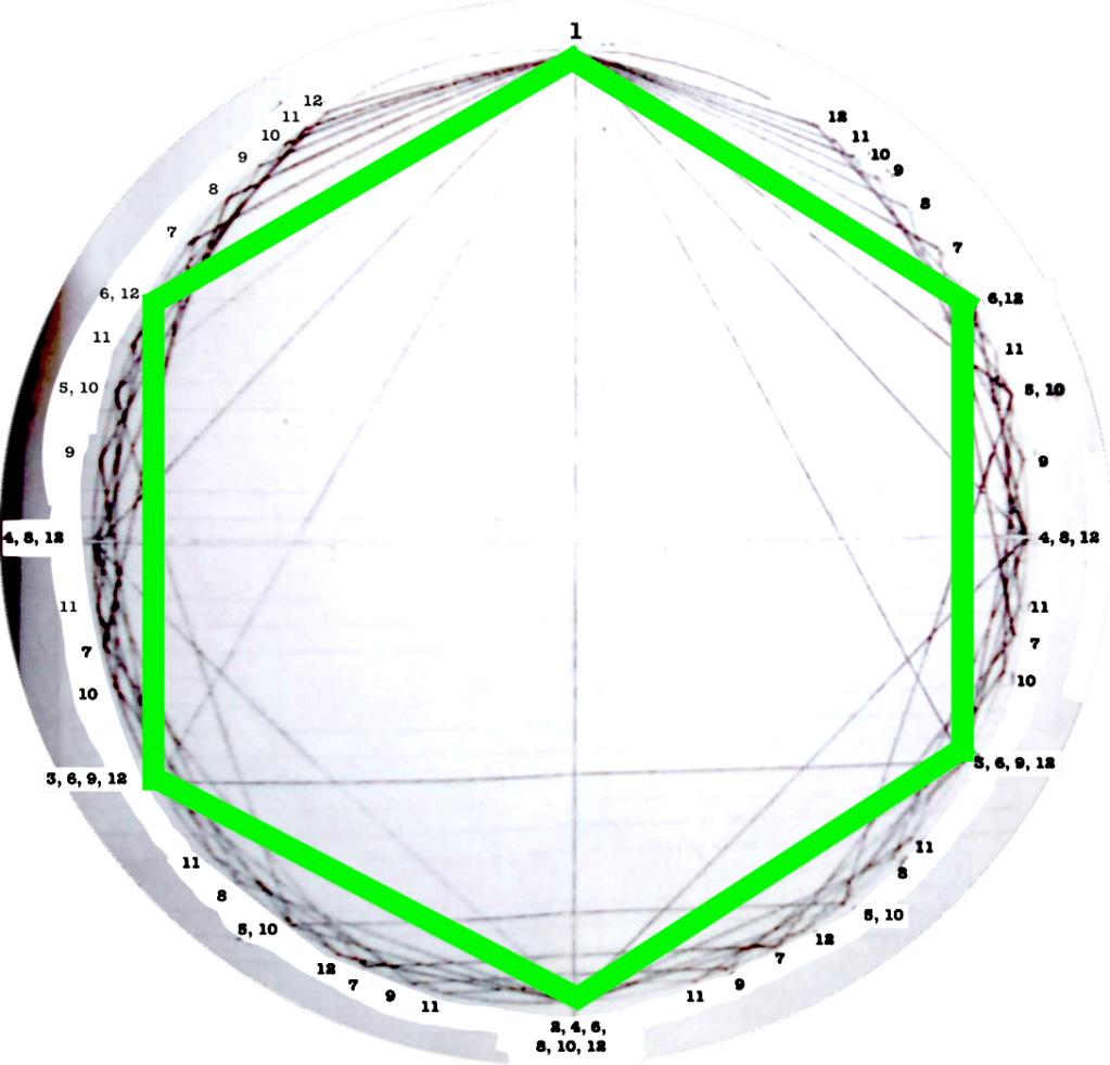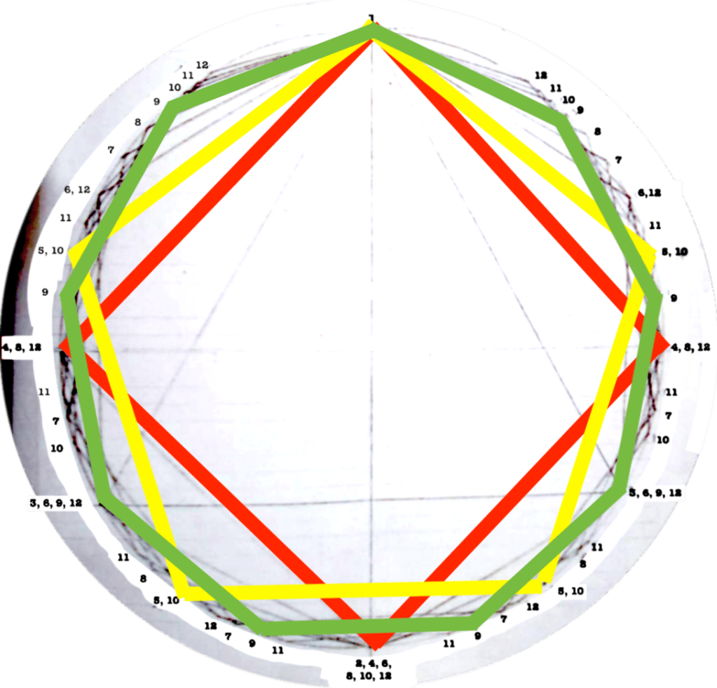 Each figure drawn in the circle represents an equilateral polygon, which gives a graphic representation of the correspective rhythmical division of the unity. This unity (the circle) can represent a bar, a beat, a subdivision, anything that has a beginning and an end.