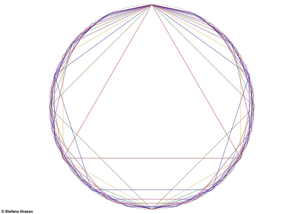 Even though it might seem obvious, I find interesting to note that the more faces the polygon has (equals: the more subdivisions you do of a “one”) the closest you get to the circumference (equals: a continuous sound).